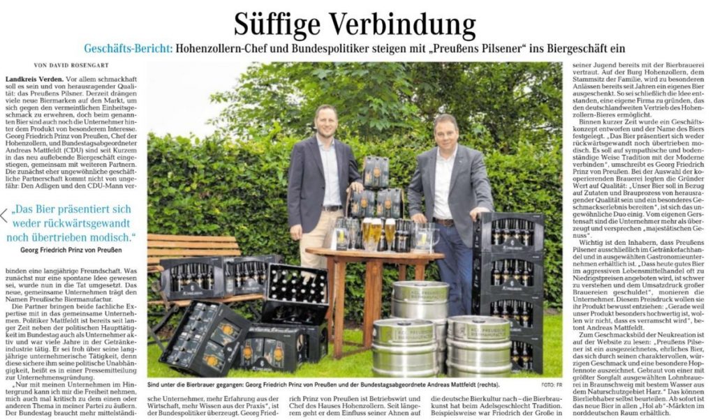 Seit dem 14. März kann das Bier der Kgl. Preußischen Biermanufactur auch über die hauseigene Website (preussische-biermanufactur.de) bezogen werden. „Aufgrund der vielen Nachfragen aus Gebieten, in denen das Bier bisher nicht über den Fachhandel erhältlich ist, haben wir uns für diese Shop-Lösung entschieden“, so Andreas Mattfeldt und Georg Friedrich Prinz von Preußen.