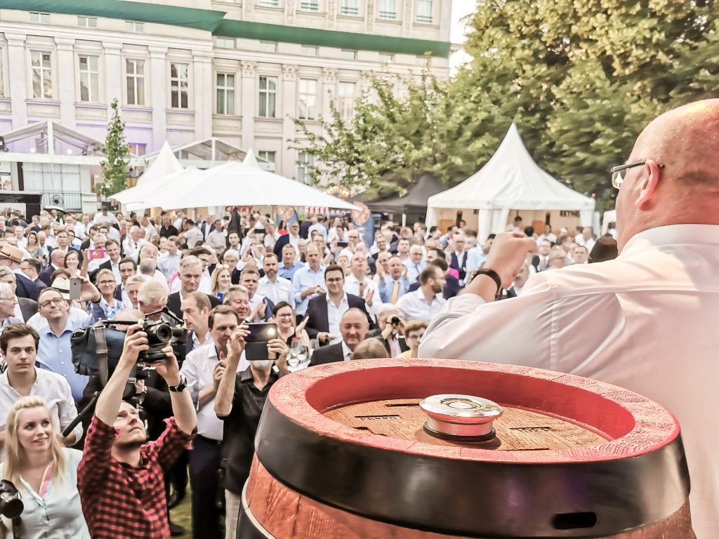 Am 25. Juni fand im Garten des Kronprinzenpalais in Berlin Mitte das jährliche Sommerfest des Parlamentskreises Mittelstand (PKM) statt. Zum ersten Mal war auch die Kgl. Preußische Biermanufactur vertreten. Nach der Begrüßungsrede durch die Bundeskanzlerin folgte der offizielle Anstich eines PREUßENS-Fasses durch Bundeswirtschaftsminister Peter Altmaier. Auf einem Gemeinschaftsstand schenkten das PREUßENS-Team sowie Mitarbeiter der Firma Reyher weitere 6 Hektoliter Bier aus. Die hochsommerlichen Temperaturen aber auch die überraschend hohe Nachfrage forderten von allen Helfenden Höchstleistungen und technisches Know-How ab. So sorgte eine speziell präparierte Vierfachkühlung dafür, dass die 2500 Gäste auch zu später Stunde noch an ein gut gekühltes Bier kamen. Bei über 30 Grad auch noch am späten Abend war das keine Selbstverständlichkeit.